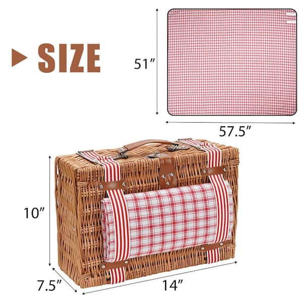 Red Check Wicker Picnic Basket with Cutlery Service Kits, Insulated Cooler Compartment and Waterproof Picnic Blanket