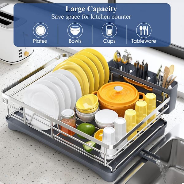Silver Standing Dish Rack with Drainboard, Rustproof Dish Drying Rack with Utensil Holder for Kitchen Counter