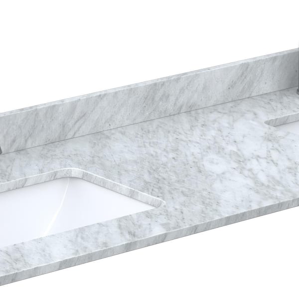• White carrara marble top includes undermount rectangular sinks