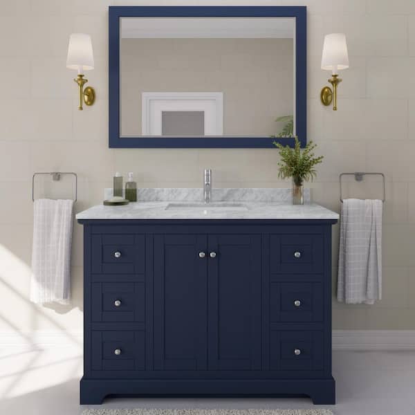 Avery 48 in. W x 22 in. D x 35 in. H Single Bath Vanity in Dark Blue with White Carrara Marble Top