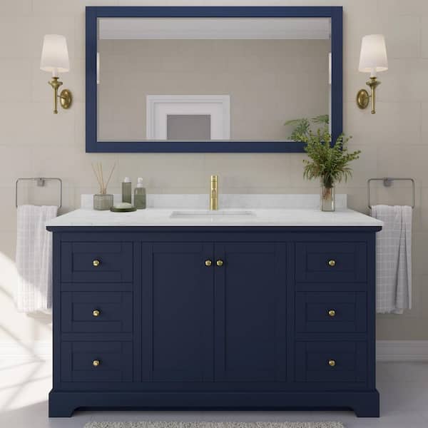 Avery 60in.Wx22 in.D Single Vanity in Dark Blue with Cultured Marble Vanity Top in Light-Vein Carrara with White Basin