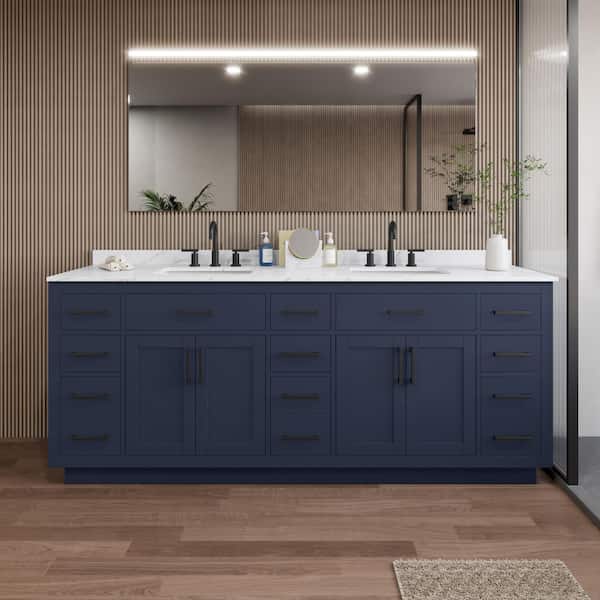 Beckett TK 84 in. W x 22 in. D x 35 in. H Double Sink Bath Vanity in Dark Blue with Matte Black Trim Giotto Quartz Top