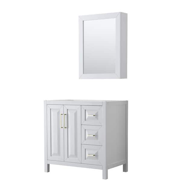 Daria 35 in. W x 21.5 in. D x 35 in. H Bath Vanity Cabinet without Top in White with Gold Trim and Med Cab Mirror