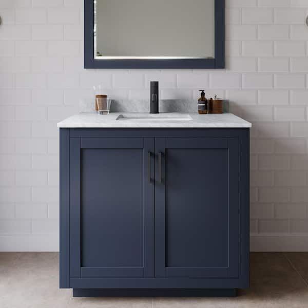 Miranda 36 in. W Single Bath Vanity in Dark Blue with Marble Vanity Top in White Carrara with White Basin and Mirror