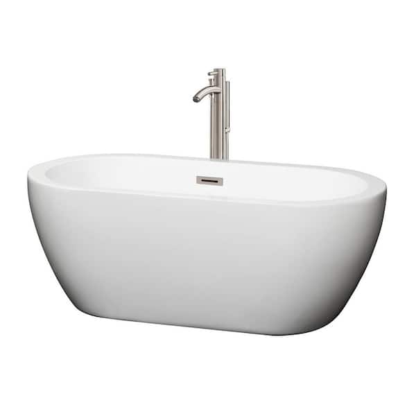 Soho 59.75 in. Acrylic Flatbottom Center Drain Soaking Tub in White with Floor Mounted Faucet in Brushed Nickel