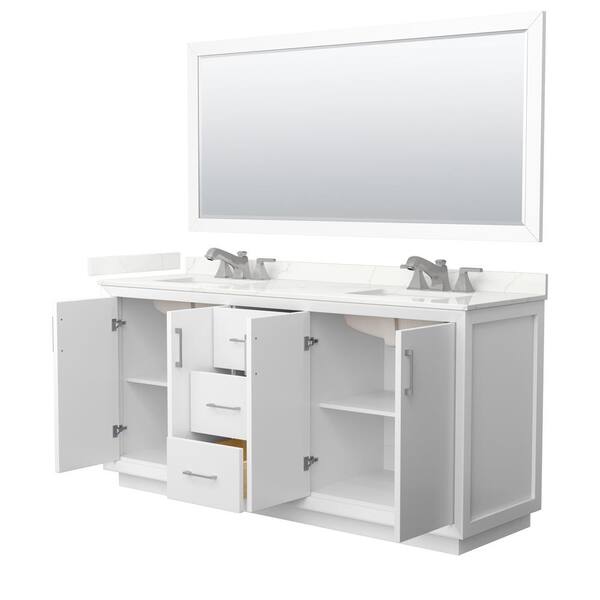 Strada 72 in. W x 22 in. D x 35 in. H Double Bath Vanity in White with Giotto Quartz Top and 70 in. Mirror