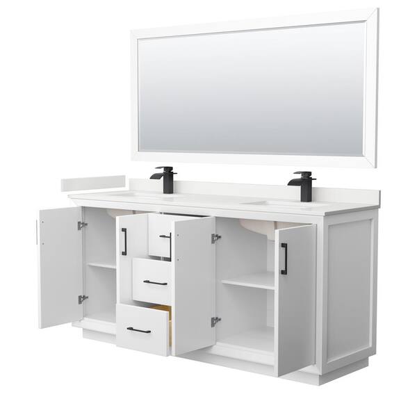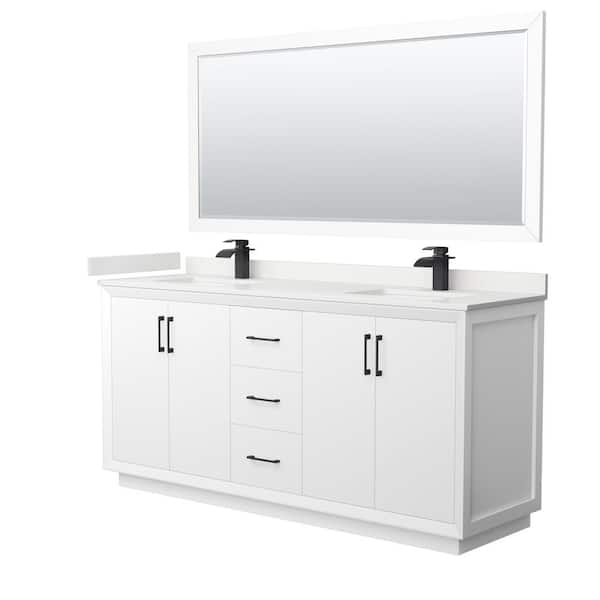Strada 72 in. W x 22 in. D x 35 in. H Double Bath Vanity in White with White Quartz Top and 70 in. Mirror