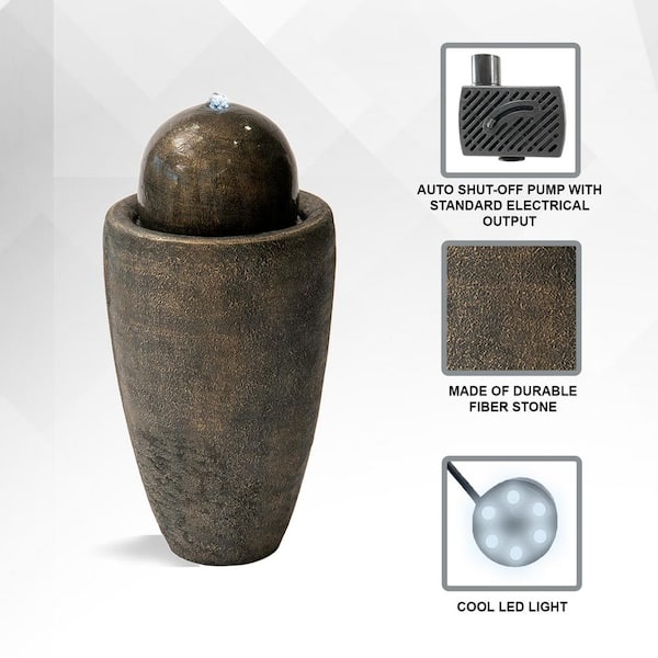 25.98 in. H Round Modern Waterfall Stone Textured Sphere Floor Fountain w/LED Light, Garden Sphere Fountain, Bronze