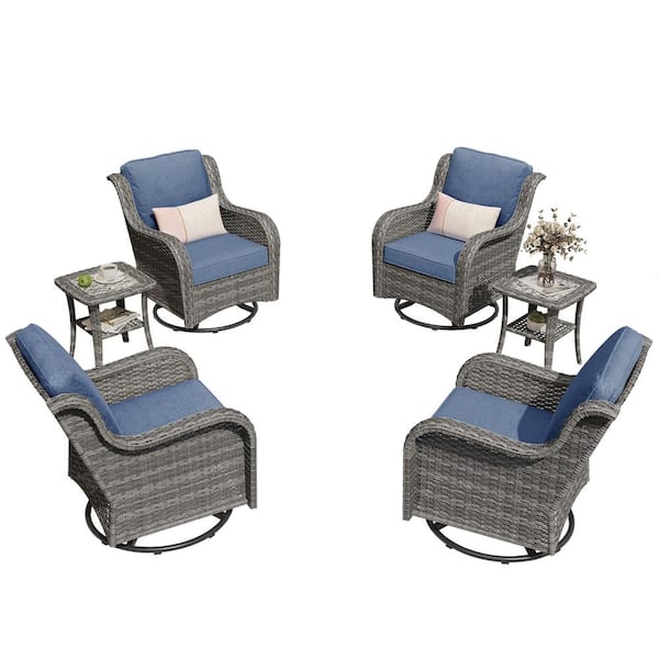 Aditi Gray 6-Piece Wicker Patio Conversation Seating Sofa Set with Denim Blue Cushions and Swivel Rocking Chairs