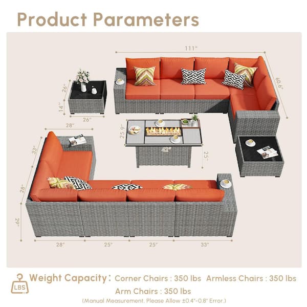 Aestheticism 13-Pieces Wicker Outdoor Patio Rectangular Fire Pit Set with Orange Red Cushions