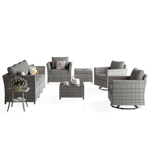 Alfresco Allure 9-Piece Wicker Patio Conversation Sectional Sofa Set with Dark Gray Cushions and Swivel Rocking Chairs
