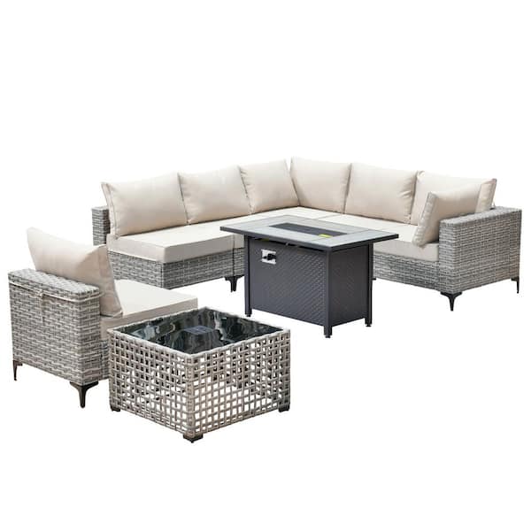 Amity 8 Pieces Wicker Patio Conversation Seating Sofa and Rectangular Fire Pit Set with Beige Cushions