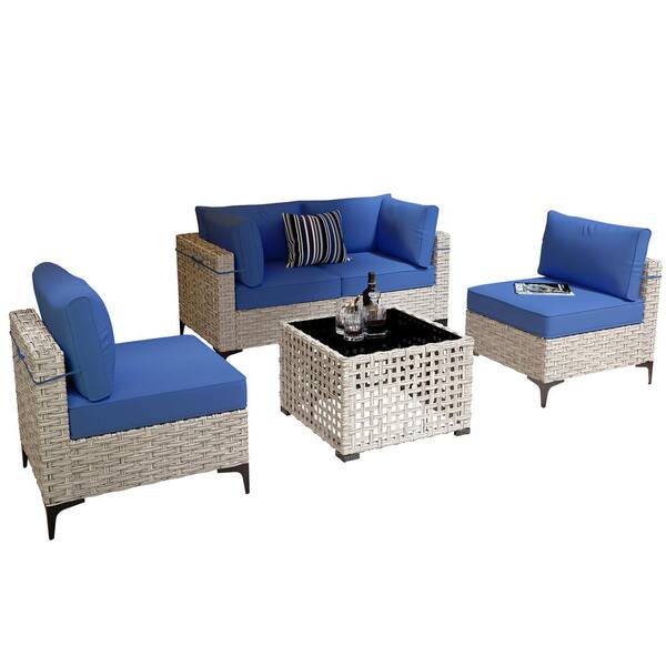 Apollo 5-Piece Wicker Outdoor Patio Conversation Seating Set with Navy Blue Cushions