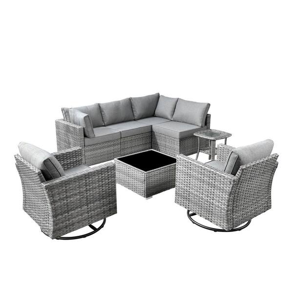 Arctic 8-piece Wicker Conversation Seating Sofa Set with Dark Gray Cushions and Swivel Rocking Chairs