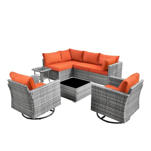 Arctic 8-piece Wicker Conversation Seating Sofa Set with Orange Red Cushions and Swivel Rocking Chairs