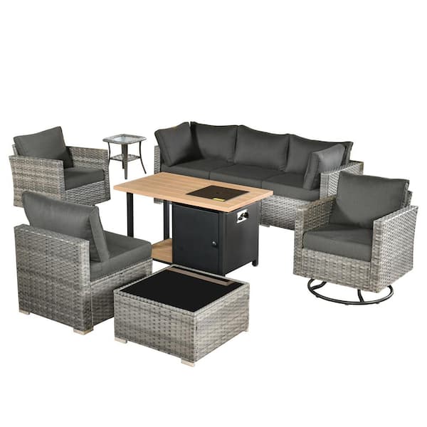 Artemis Gray 9-Piece Wicker Patio Rectangular Fire Pit Set with Black Cushions and Swivel Rocking Chairs