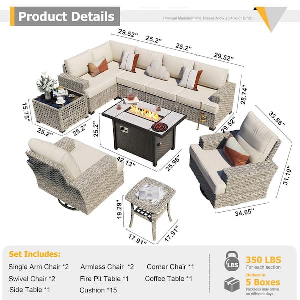 Aurea 10-Pieces Wicker Outdoor Patio Rectangular Fire Pit Set with Beige Cushions