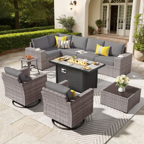 Beatrice 10-Piece Wicker Patio Rectangular Fire Pit Set with Drak Gray Cushions and Swivel Rocking Chairs