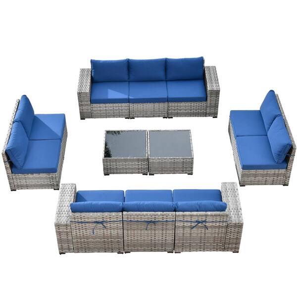 Beatrice 13-Piece Wicker Patio Rectangle Fire Pit Conversation Set with Navy Blue Cushions