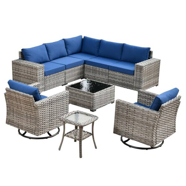 Beatrice 9-Piece Wicker Patio Conversation Seating Sofa Set with Navy Blue Cushions and Swivel Rocking Chairs