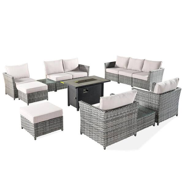 Bella 13-Piece Wicker Patio Rectangle Fire Pit Conversation Set with Beige Cushions