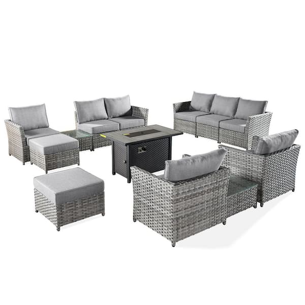 Bella 13-Piece Wicker Patio Rectangle Fire Pit Conversation Set with Dark Gray Cushions