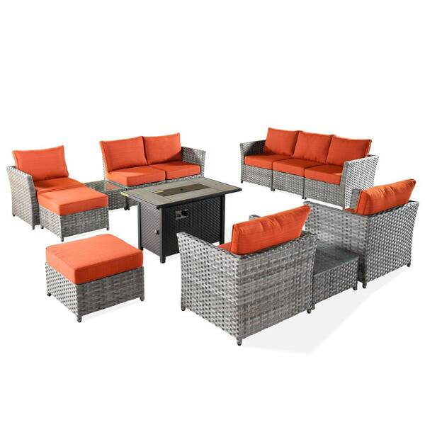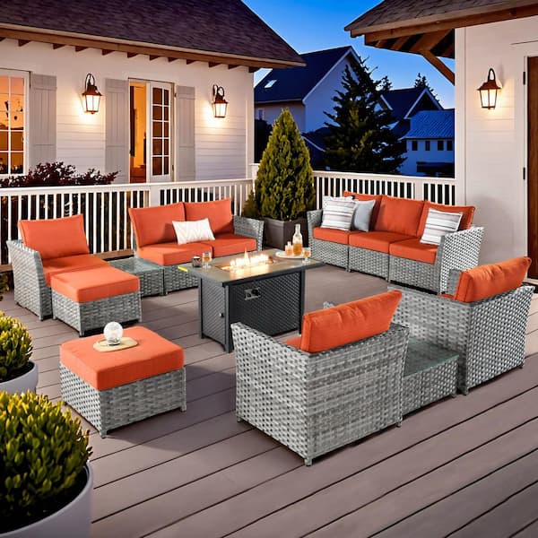 Bella 13-Piece Wicker Patio Rectangle Fire Pit Conversation Set with Orange Cushions