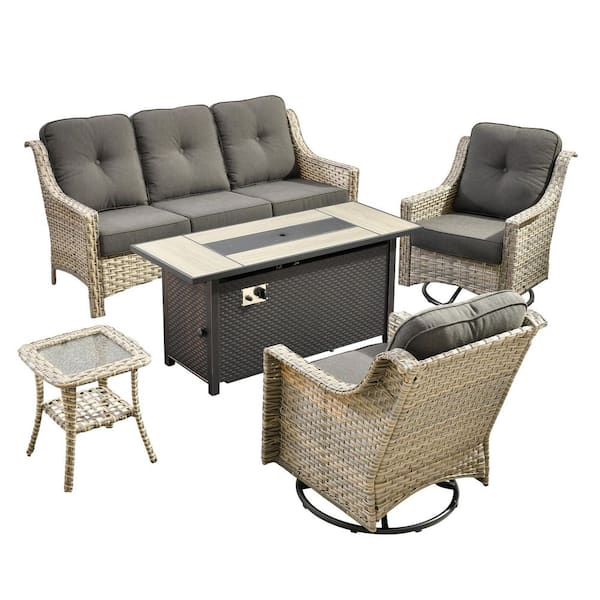 Blanche 5-Piece Wicker Patio Rectangular Fire Pit Set with Black Cushions and Swivel Rocking Chairs