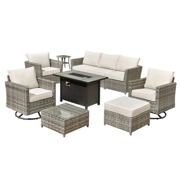 Boreas 10-Piece Wicker Patio Rectangular Fire Pit Set with Beige Cushions and Swivel Rocking Chairs