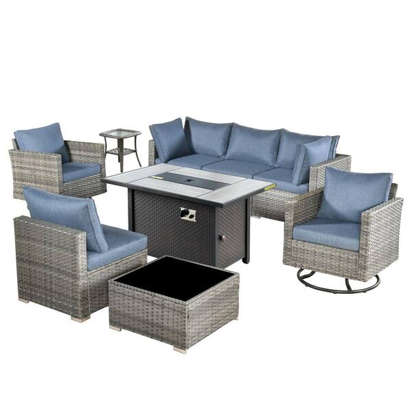 Clove 9 Pieces Wicker Outdoor Patio Rectangular Fire Pit Set and Swivel Rocking Chairs with Denim Blue Cushions