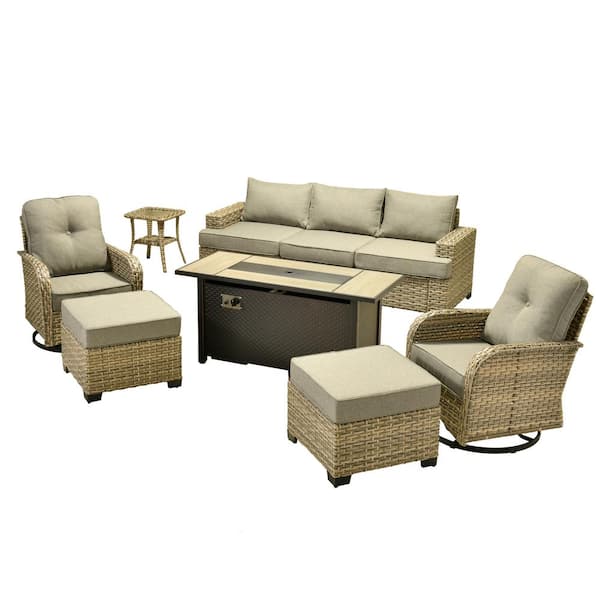 Daisy 9-Piece Wicker Rectangular Fire Pit Sets and Swivel Rocking Chairs with Dark Gray Cushion