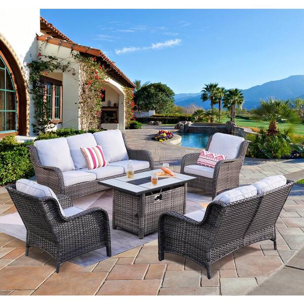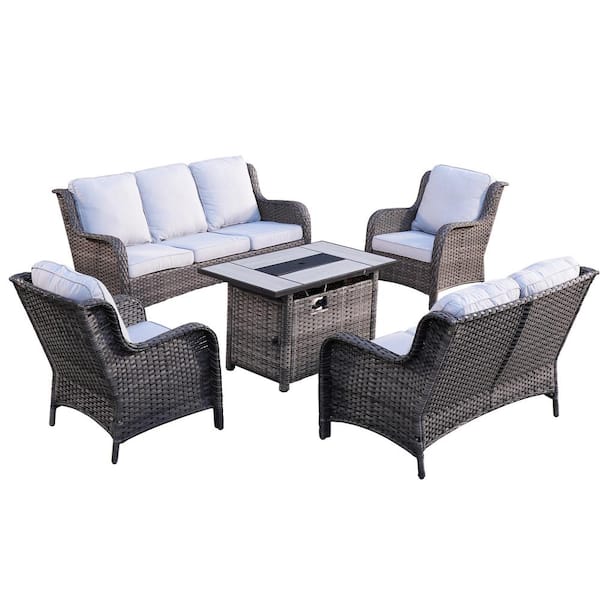 Daydreamer Gray 5-Piece Wicker Patio Fire Pit Set with Rectangular Gray Cushions