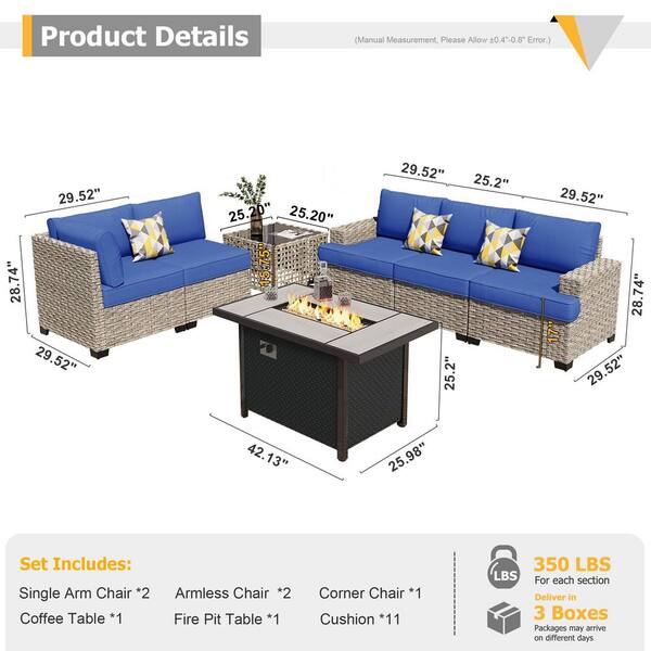 Echelon 7-Pieces Wicker Outerdoor Patio Rectangular Fire Pit Set with Navy Blue Cushions