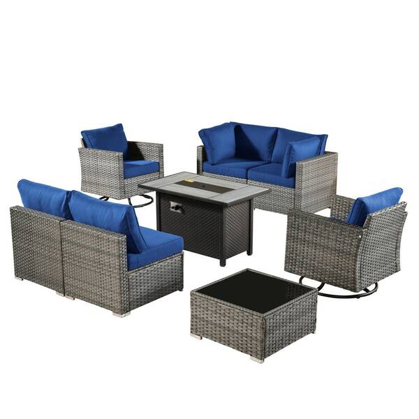 Echo 9-Piece Wicker Patio Rectangular Fire Pit Set with Navy Blue Cushions and Swivel Rocking Chairs