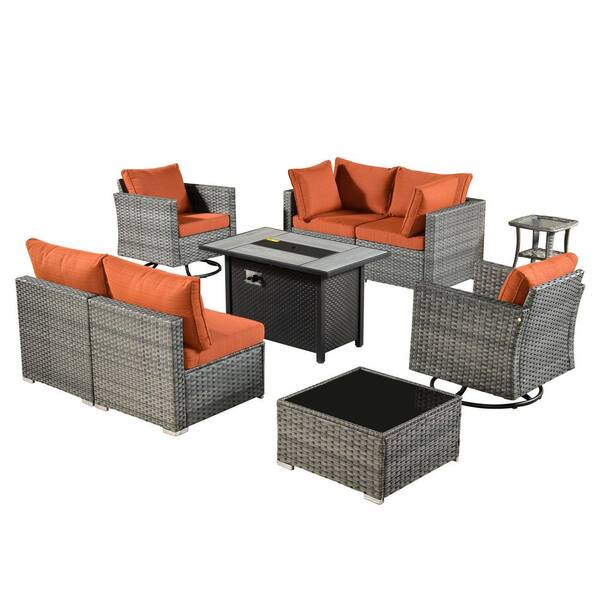 Echo 9-Piece Wicker Patio Rectangular Fire Pit Set with Orange Red Cushions and Swivel Rocking Chairs