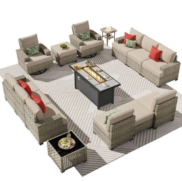 Eden Vine 15 Pieces Wicker Rectangular Fire Pit Sets and Swivel Rocking Chairs with Beige Cushion