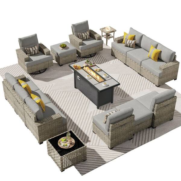 Eden Vine 15 Pieces Wicker Rectangular Fire Pit Sets and Swivel Rocking Chairs with Dark Grey Cushion