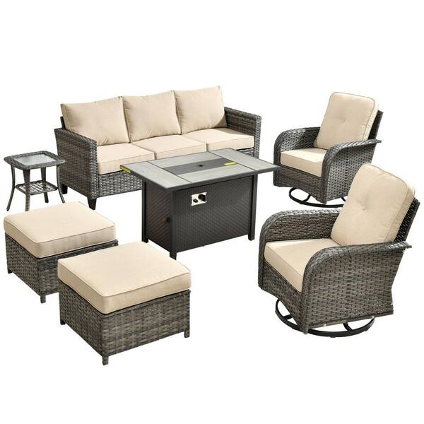 Elvira 7-Piece Wicker Patio Rectangular Fire Pit Set with Beige Cushions and Swivel Rocking Chairs