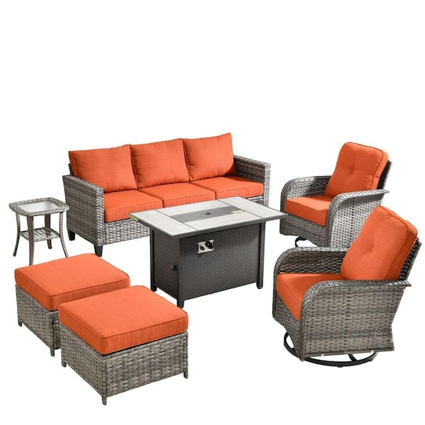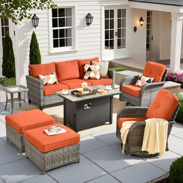 Elvira 7-Piece Wicker Patio Rectangular Fire Pit Set with Orange Red Cushions and Swivel Rocking Chairs