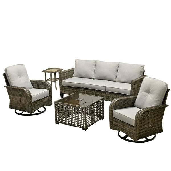 Elvira Gray 5-Piece Wicker Patio Conversation Seating Sofa Set with Light Gray Cushions and Swivel Rocking Chairs