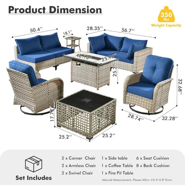 Enchanted 9 Pieces Wicker Outdoor Patio Rectangular Fire Pit Set and Swivel Rocking Chairs with Navy Blue Cushions