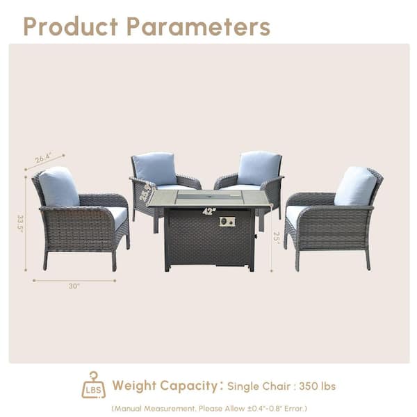Epoch 5-Pieces Wicker Outdoor Patio Rectangular Fire Pit Set with Gray Cushions