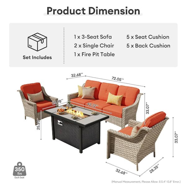 EternalOasis 4 Pieces Wicker Outdoor Patio Rectangular Fire Pit Set with Orange Red Cushions
