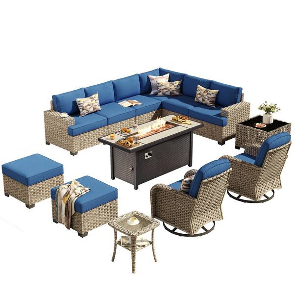 Eternity 13 Pieces Wicker Outdoor Patio Rectangular Fire Pit Set and Swivel Rocking Chairs with Navy Blue Cushions