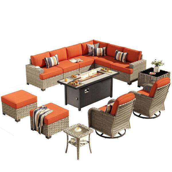 Eternity 13 Pieces Wicker Outdoor Patio Rectangular Fire Pit Set and Swivel Rocking Chairs with Orange Red Cushions