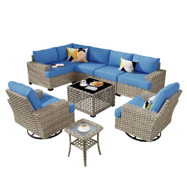 Eunoia 9-Pieces Wicker Patio Conversation Seating Sofa Set with Diamond Blue Cushions and Swivel Rocking Chairs