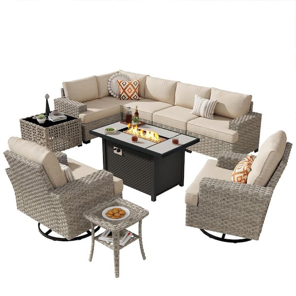 Felicity 10 Pieces Wicker Outdoor Patio Rectangular Fire Pit Set and Swivel Rocking Chairs with Beige Cushions