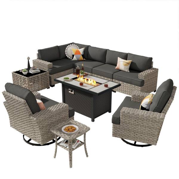 Felicity 10 Pieces Wicker Outdoor Patio Rectangular Fire Pit Set and Swivel Rocking Chairs with Black Cushions