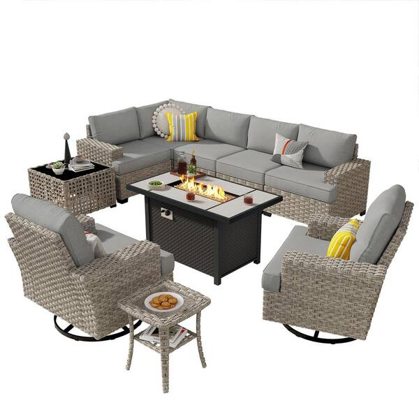 Felicity 10 Pieces Wicker Outdoor Patio Rectangular Fire Pit Set and Swivel Rocking Chairs with Dark Gray Cushions