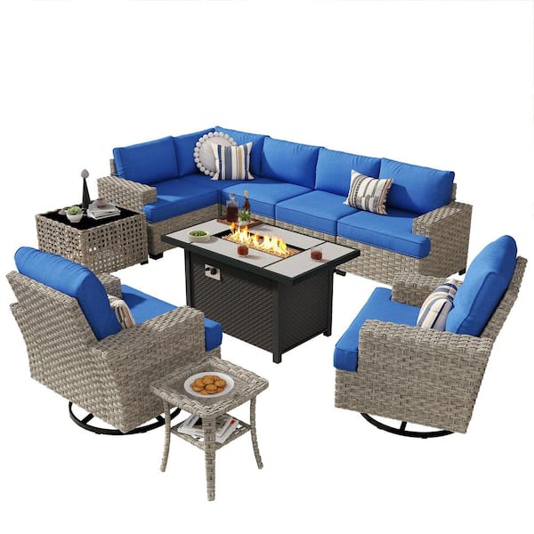 Felicity 10 Pieces Wicker Outdoor Patio Rectangular Fire Pit Set and Swivel Rocking Chairs with Navy Blue Cushions